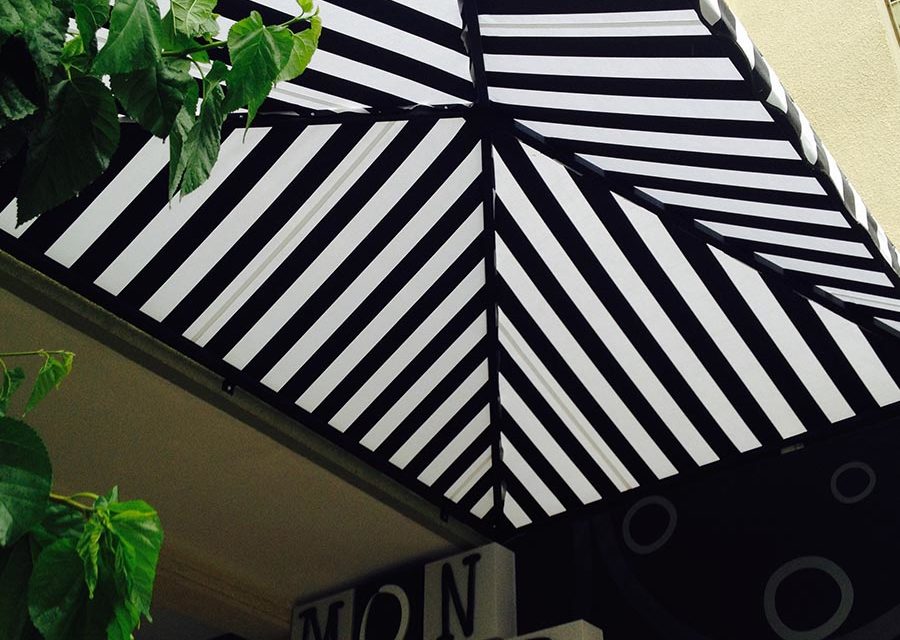 Τέντα με βραχίονες βαρέος τύπου, με εκτυπωμένο πανί σε γνωστή αλυσίδα καφέ στο κέντρο της Αθήνας